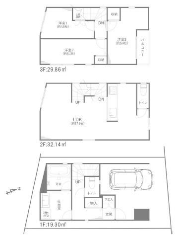 The 81.30 square meter (24.59 tsubo) house sits on a 52.02 square meter (15.73 tsubo) lot across three floors. The 3LDK layout provides flexibility for families, with spacious living, dining, and kitchen areas. The property features an all-electric system for energy efficiency and environmental consciousness.