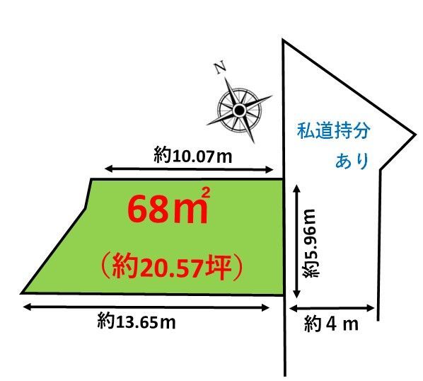 The property details include specific access information. The road frontage situation is described as one-sided, with a breakdown noting a 4-meter wide private road to the southeast, providing a 6-meter frontage. The land itself is registered with an area of 68 square meters (approximately 20.57 tsubo). It is situated within an urbanization promotion area and is zoned as a Category I Low-Rise Exclusive Residential District, with a building-to-land ratio of 40% and a floor area ratio of 60%. The land is classified as 'other (wilderness)' and is currently vacant. The shape of the plot is rectangular, and the transfer of ownership can be arranged immediately.
