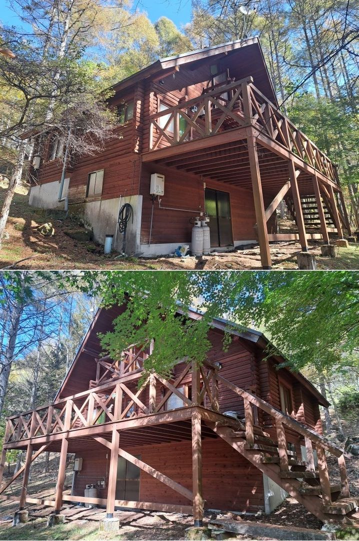 This distinctive brown log house is located in the serene Fureai-no-Sato villa area within the Kita-Shirakaba Highlands of Nagawa Town, Nagano Prefecture. The property is part of a well-maintained, spacious villa development set within beautiful national forest land, offering a peaceful and majestic atmosphere. The villa area is situated at an elevation of approximately 1,350 meters, making it an ideal summer retreat and a convenient base for winter skiing, with the Blancher Takayama Ski Resort just a 5-minute drive away.