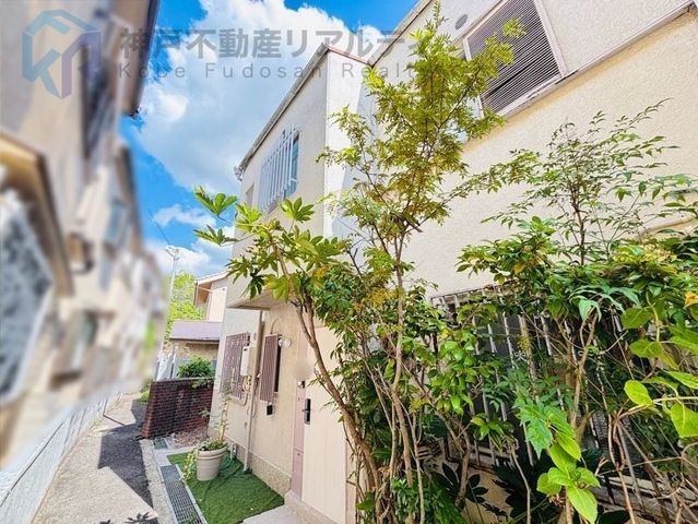 The property is located in Kusuya-cho, Hyogo Ward, Kobe City, Hyogo Prefecture. It is a 14-minute walk from Okura-yama Station on the Seishin-Yamate subway line. Nearby amenities within walking distance include Kobe Gogo Post Office (5 minutes, 350m), Kobe Municipal Yamanote Elementary School (6 minutes, 460m), a park (4 minutes, 280m), a convenience store (550m), a supermarket (730m), a general hospital (660m), a drugstore (350m), and a bank (620m). The property uses city gas, which is relatively inexpensive and environmentally friendly. Additional monthly fees include a neighborhood association fee of 200 yen and an annual exterior light fee of 4,200 yen.