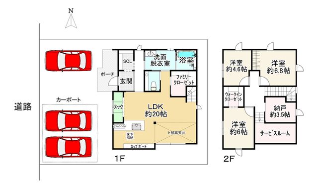 The home is designed for comfort and practicality. The living room boasts high ceilings, creating a bright and open atmosphere. Storage is abundant throughout, with features including an SCL (shoe closet), a family closet, and a walk-in closet (WIC). The parking area can accommodate up to three cars in parallel, with two spaces under a carport.