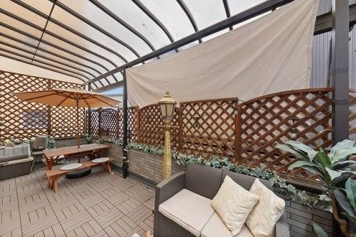 The property features a spacious LDK of approximately 26.7 tatami mats with a high ceiling and an open feel. The kitchen is a semi-open I-type system kitchen with a glass top stove, dishwasher, and a separate entrance. The bathroom is a full auto bath with a bath TV, window, and separate shower and toilet. The vanity is a three-way mirror with ample storage. There is a powder room and a laundry room with ventilation and drying functions. The property also includes a roofed balcony space, a garage that can accommodate 3 or more cars, and a warehouse at the back of the parking area. The property is also suitable for use as a warehouse, garage, or office.
