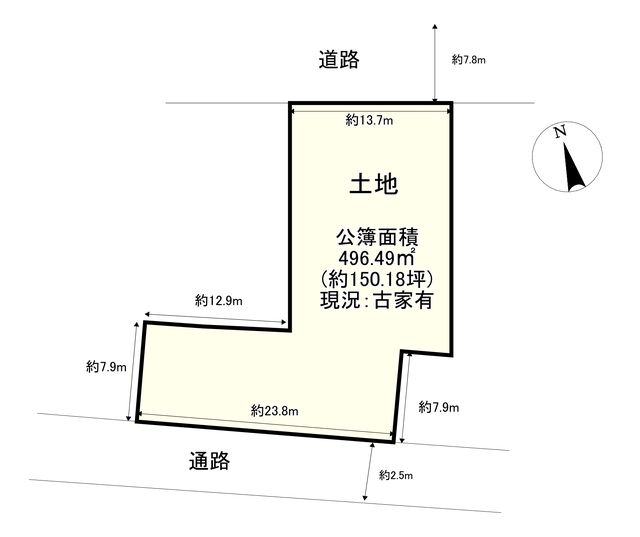 Regarding the existing buildings on the land: (1) A three-story steel-framed structure with galvanized steel sheet roofing. The total floor area is 351 square meters, evenly distributed with 117 square meters on each floor. (2) A single-story wooden structure with galvanized steel sheet roofing, with a floor area of 16.56 square meters. The land itself is flat, designated as residential land within a City Planning Area (Urbanization Promotion Area), zoned as a Category II Residential District. It has a building-to-land ratio of 60% and a floor area ratio of 200%. The property fronts a public road to the north with a frontage of 13.7 meters and a setback is not required. Utilities include public water supply.