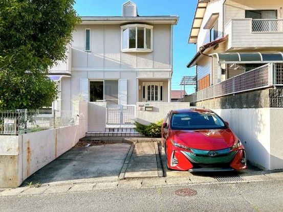 The property is situated on a south-facing plot with a road width of approximately 6 meters, allowing for two parallel parking spaces. There is a covered porch outside the kitchen service entrance. The neighborhood is quiet and residential, with a supermarket about 800 meters away and a convenience store about 650 meters away. The property is about a 33-minute walk from Shin-Shimonoseki Station on the Sanyo Main Line.