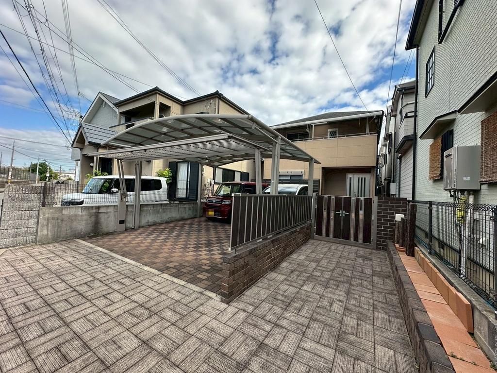 Key equipment and features include a counter-style kitchen facing the living room, allowing for interaction with family while cooking. The property comes with a spacious entrance with a shoe cabinet, a bathroom with a bathtub for relaxation, and a separate washroom. There are two toilets with bidet seats, both with windows. A TV monitor intercom provides security. All rooms have closets, and there is attic storage for seasonal items. A terrace and a south-facing balcony make laundry drying efficient. A large carport provides covered parking for up to four vehicles. The front road is approximately 8.2 meters wide, making it easy for drivers.