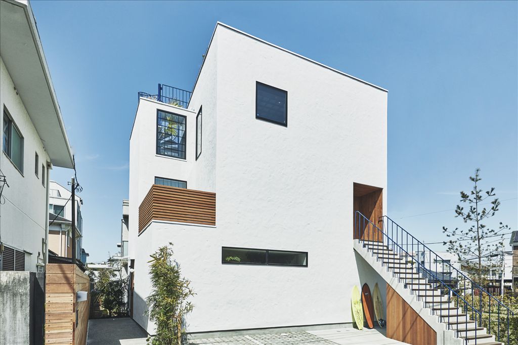 This unique property is a resort house located in the highly desirable Zaimokuza area of Kamakura, Kanagawa Prefecture. The building, constructed in February 2021, is a three-story wooden structure with a total floor area of approximately 154.93 square meters. It features a versatile layout of 1LDK + 2LDK, offering flexible living and income-generating spaces. A key feature is the rooftop terrace, providing outdoor space with views, accessible via a spiral staircase from the living area.