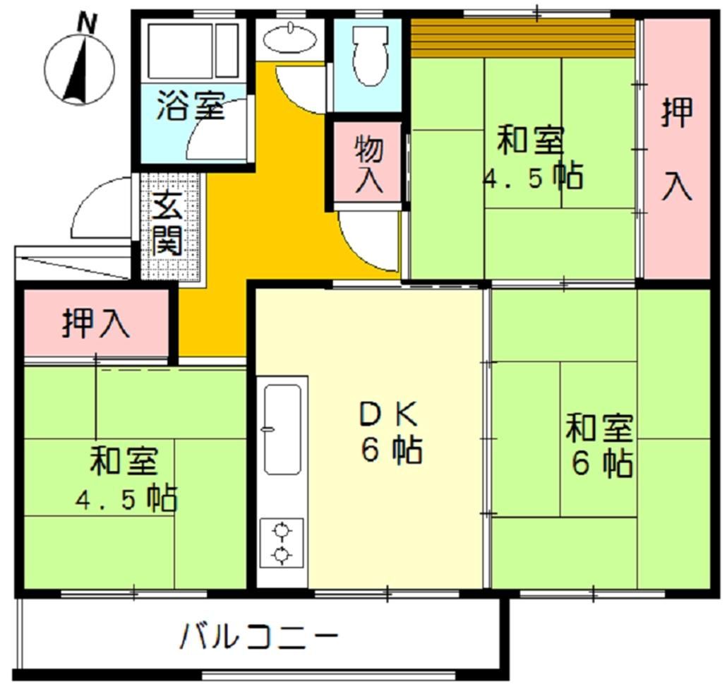 This property is a 45.43 sqm (approximately 13.74 tsubo) 3DK apartment located on the 2nd floor of a 5-story reinforced concrete (RC) building in the Fujimadai 3-chome area of Kasugai City, Aichi Prefecture. Built in February 1969, the apartment features a south-facing balcony, ensuring excellent sunlight and ventilation. The layout includes a DK (dining-kitchen) of approximately 6 tatami mats, one 6-tatami mat Japanese-style room, and two 4.5-tatami mat Japanese-style rooms.