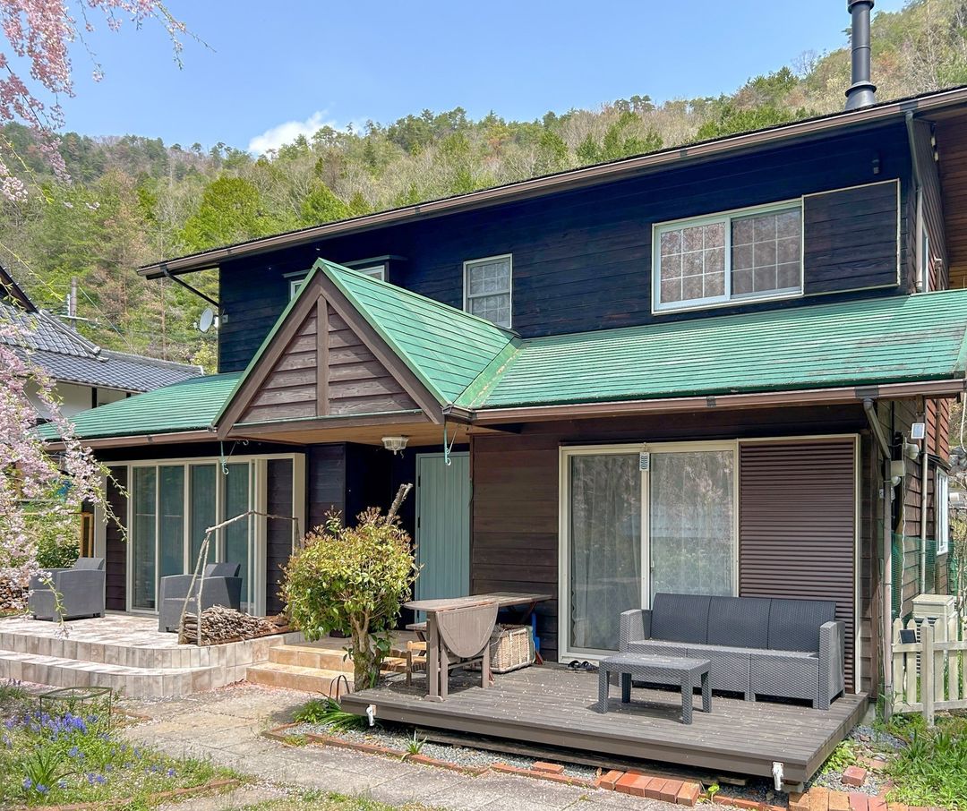 Izumi Villa is a distinctive mountain villa located in the scenic Miyama-cho area of Nantan City, Kyoto Prefecture. Built in 1996, this property masterfully captures traditional Japanese charm with its striking black wooden walls, a distinctive gabled entryway, and a green roof that blends harmoniously into the surrounding natural landscape. A cozy chimney hints at the practical wood-burning stove inside, adding a rustic touch. The front yard is graced by a magnificent cherry tree, offering seasonal beauty right outside your window.