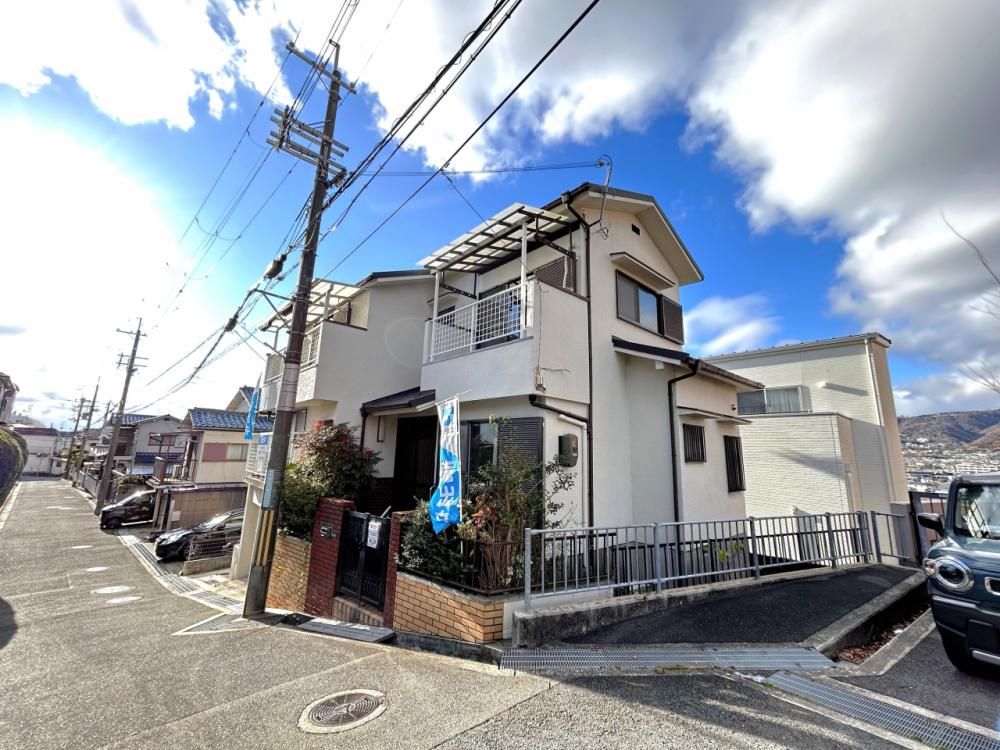 The house is situated on a quiet residential street with low traffic volume in Minoh City, Osaka Prefecture. It is a corner lot with road frontage of 4.4m to the southeast and 5.0m to the east. The location offers convenient access to daily amenities: a 7-Eleven convenience store is approximately 550m away (a 7-minute walk), Life Minoh supermarket is about 1300m away (a 17-minute walk or 3-minute drive), and Minoh Municipal Hospital is 2000m away (a 25-minute walk or 4-minute drive). For commuting, Makiochi Station on the Hankyu Mino Line is approximately 950m away, a 12-minute walk, with services running from early morning. The property also enjoys a view from the second-floor west-facing room, characteristic of its location on a slight elevation.