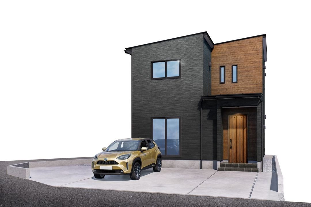 This new construction detached house in Imizu City, Toyama Prefecture, is built to ZEH (Net Zero Energy House) specifications, featuring high insulation and a 5.64kW solar panel system as standard. The modern exterior is based on black walls with brown accents around the entrance, creating a stylish and calm design with simple yet contrasting appeal.