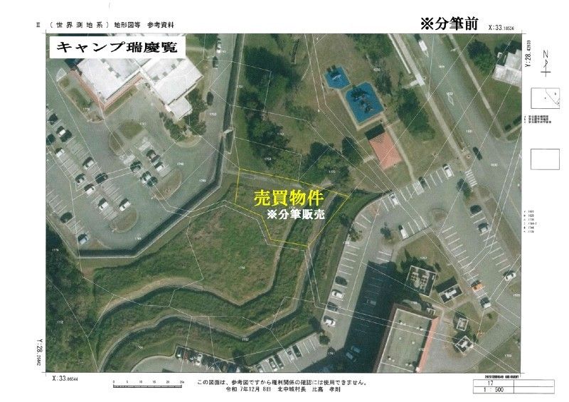The agent's notes provide critical details. This is a military land property in Kitachin Village, Adaniya, Camp Zukeran 11 sqm. In the case of a subdivision of 11 sqm from a total area of 695 sqm, the annual land lease fee is 19,612 yen with a multiplier of 48. The annual land lease fee and fixed asset tax will be prorated and settled at the time of closing. There is no brokerage commission. The aerial photograph is from before the subdivision. There is no scheduled return of the land. Feel free to inquire.