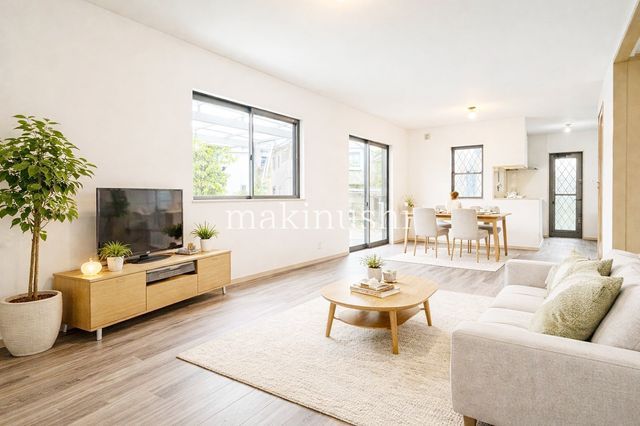 Key features highlighted by the agent include a parking area suitable for two cars side-by-side, a private garden, and an all-electric home system. All bedrooms on the second floor are spacious, each over 6 tatami mats in size. The home boasts a living room staircase design, intended to foster family interaction. The property is move-in ready with numerous modern amenities. The kitchen is equipped with an IH system counter kitchen featuring a dishwasher/dryer, under-floor storage, and ample overhead cabinets. The bathroom includes a large bathtub with a reheating function, and there are toilets on both the first and second floors for convenience, both with warm-water washlet seats. A powder room with a washbasin and shower, a large entrance shoe box, and a balcony with a roof are additional practical features. All rooms come with built-in storage.