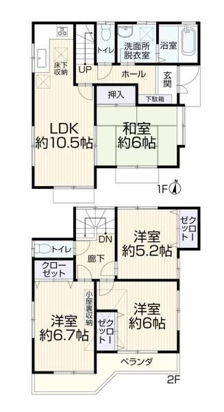 The property features a 4LDK layout with a total floor area of 85.05 sqm (approximately 25.7 tsubo) spread over two stories. It sits on a land plot of 110.01 sqm (approximately 33.3 tsubo). The house faces a south-facing road, ensuring good sunlight. All rooms are equipped with storage space, and there is additional attic storage, providing ample living space.