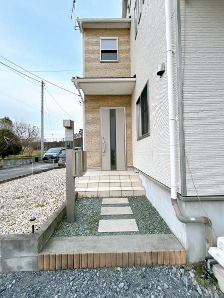 The renovation scope is comprehensive. The exterior will undergo partial wall cleaning and joint repair. Inside, wallpaper is being replaced throughout, including in the entrance hall and all bedrooms. The Japanese-style room on the first floor will have its shoji screens and wallpaper replaced. The unit bath will be cleaned with faucet and showerhead replacements, while the toilets on each floor are being completely replaced with new units. The vanity will be cleaned, and the balcony will receive waterproof coating. The entrance door will have its locks changed before handover, and a shoe cabinet will be installed in the hall. All rooms will have fire alarms installed, and storage areas within rooms will be cleaned. The parking area has been cleared of a shed, allowing for the vertical and parallel parking of up to four standard passenger cars on the 5-meter-wide front road.