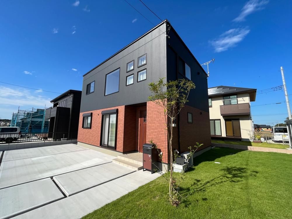This is a 3LDK, two-story wooden house located at Motoishikawa-cho, Mito City, Ibaraki Prefecture. It is a relatively new used home built in October 2022, situated within a large-scale developed residential area called Tokiwa no Mori. The property features a spacious 20-tatami mat LDK, an open ceiling (吹抜け) creating a sense of openness, good sunlight exposure, and a quiet residential setting. The property has a large parking area with space for three or more cars. The land area is 249.99 m² and the building area is 106.82 m². The property is equipped with a system kitchen, bathroom dryer, shower-equipped vanity, walk-in closet, shoe-in closet, pantry, floor heating (implied by the features listed), and two toilets. The site is flat and faces a 6-meter wide road to the south. The property has a building confirmation certificate, low-carbon certification, and a soil survey report. The property is listed for sale at 27,900,000 yen. The nearest station is Oarai Station on the Kashima Rinkai Railway, approximately 73 minutes on foot. The property is being handled by Trace Fudosan, a real estate agency based in Tsukuba, Ibaraki.