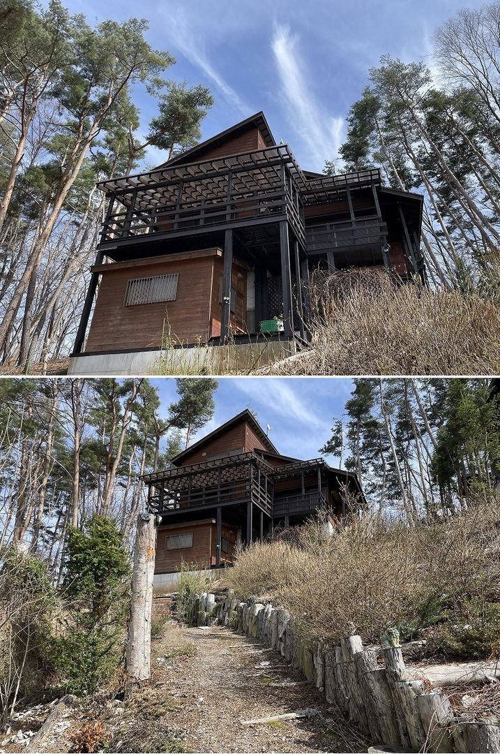 According to the agent's special notes, the property's utilities are supplied by Chubu Electric Power, town water, kerosene, and a simple flush toilet system (night soil removal). The property includes a 9.93 sqm storage shed. The living room on the first floor features a double-height ceiling with exposed solid pillars, creating a classic vacation home atmosphere. The kitchen counter includes built-in dish storage, and both Japanese-style rooms have direct access to the terrace deck. The second floor contains a Western-style room connected to a Japanese-style room, making it suitable for multi-person living or permanent residence. The west-facing, sloped lot includes a sunny vegetable garden area enclosed by logs and parking space for two vehicles.