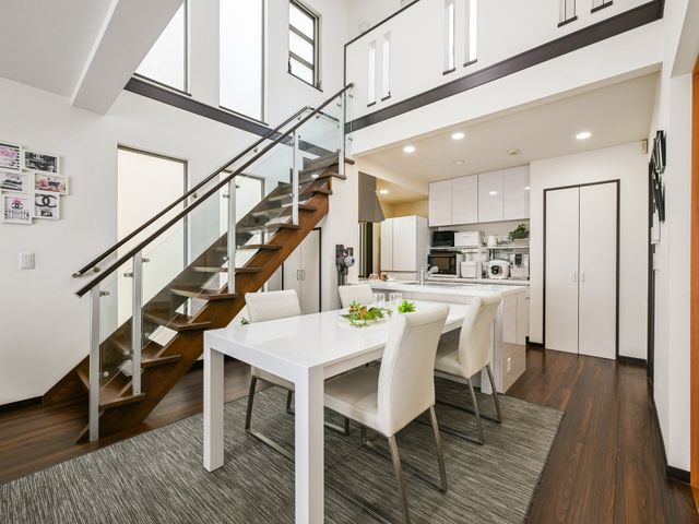 The house features a spacious 17.7-jo (approx. 28.6 sqm) LDK (Living-Dining-Kitchen) area with a double-height ceiling, allowing warm sunlight to filter in and creating an open, airy feel perfect for family relaxation. The layout includes four Western-style rooms: a large approximately 8.7-jo room suitable for a master bedroom, a 5.7-jo room with a south-east facing balcony, and a 5.3-jo room. All bedrooms are equipped with built-in storage. The property includes a loft, adding to its functional space.