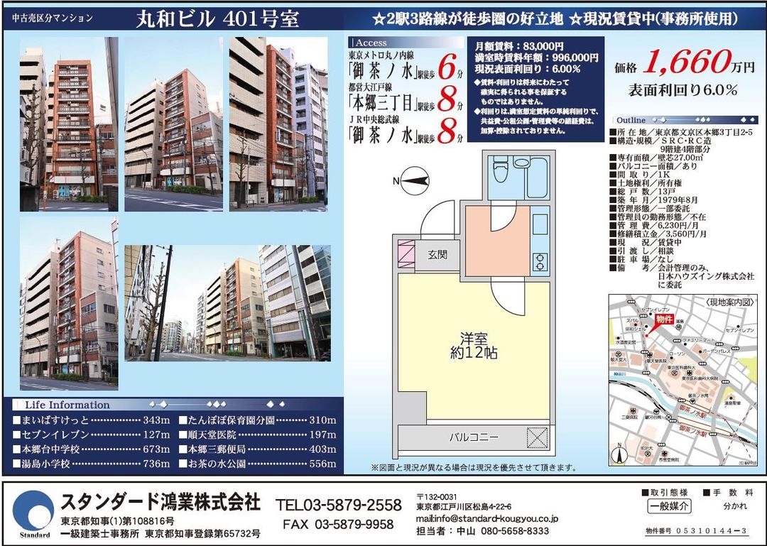 This property is a compact 1K apartment located on the 4th floor of the 9-story Maruwa Building in Bunkyo Ward, Tokyo. The unit offers a wall-core exclusive area of 27 sqm (approximately 8.16 tsubo) and features a 3 sqm balcony with a primary western exposure. The building itself, constructed in August 1979, is an SRC (steel reinforced concrete) structure with a total of 13 units. The current annual projected rental income is 996,000 yen, yielding an estimated 6.00% return. The property is currently tenanted, with a potential handover timing available for consultation.