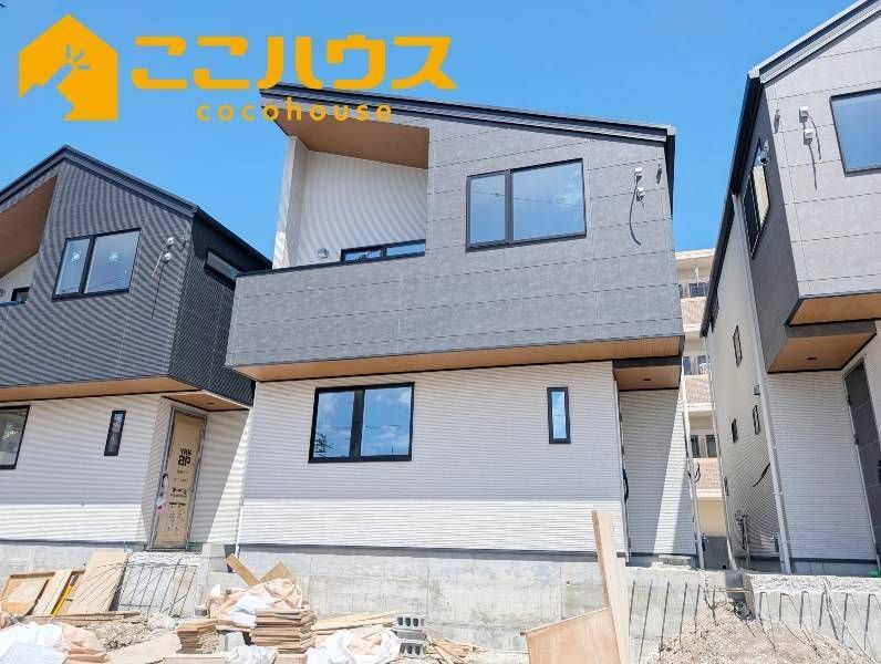 This newly constructed detached house, located in the Naka district of Tomigusuku City, Okinawa, offers a modern living space with a total floor area of approximately 99.88 square meters (about 30.2 tsubo) on a land plot of approximately 113.38 square meters (about 34.3 tsubo). The property features a 3LDK layout with three Western-style rooms measuring 6.1, 6.0, and 5.0 tatami mats respectively, and a combined living, dining, and kitchen area of 18.0 tatami mats. The two-story wooden structure is scheduled for completion in January 2026.