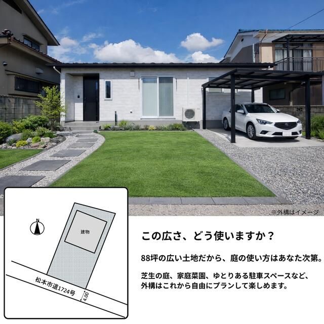 This newly constructed detached house, completed in September 2025, offers a bright and sophisticated living environment in a quiet residential neighborhood of Matsumoto, Nagano Prefecture. The property features a clean, elegant white exterior and is designed with a focus on efficiency and family-friendly living. The layout incorporates a "shortest movement line" concept to streamline household tasks, with the kitchen positioned adjacent to the laundry area for convenience.