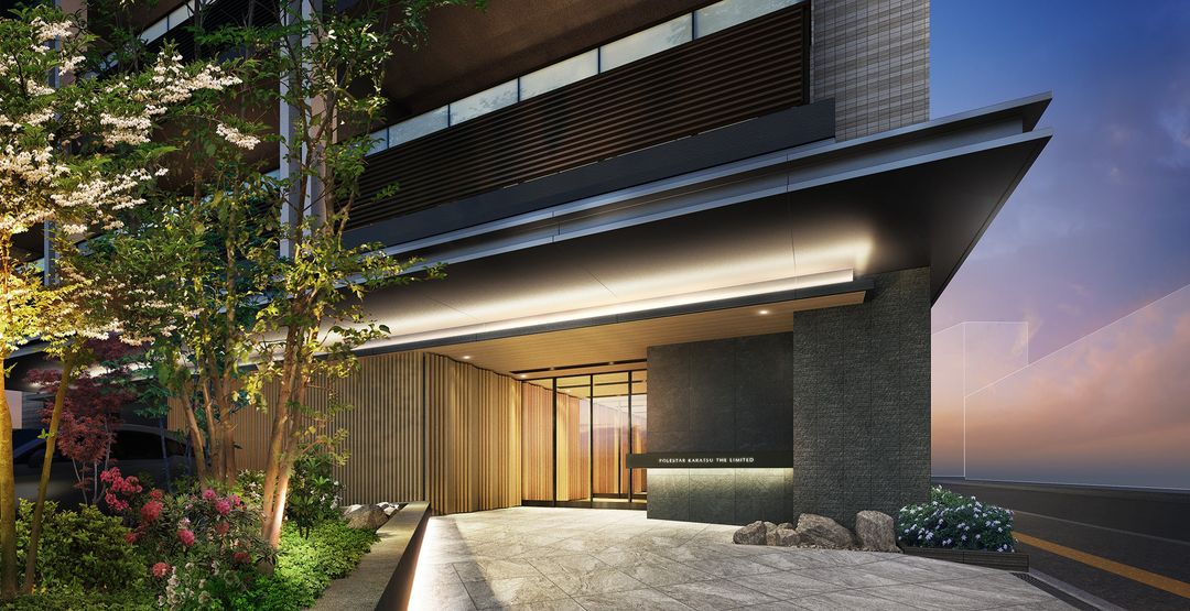 Prestige Karatsu The Limited is a new condominium development that harmonizes with the local streetscape while asserting its own distinctive presence. Its facade features elegant, vertical mullions and earth-toned and ivory exterior tiles that convey a soft yet solid impression. The balcony railings in bronze, pure green, and white add a touch of brilliance, reminiscent of the traditional Karatsu-yaki pottery. The entrance approach, symbolizing entry into a private residence, is marked by a large, horizontally extending canopy that creates a dignified atmosphere, while wave-patterned louvers on the wall add dynamic movement to the space, welcoming visitors gracefully. Inside, the entrance hall combines material textures and colors to create a sharp, substantial space, with large sashes reaching to the ceiling that draw in bright sunlight, seamlessly connecting indoors and outdoors and bringing art-like beauty and comfort into daily life.