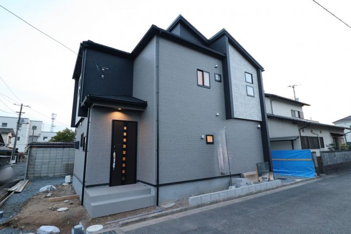 The property features a modern, three-dimensional exterior design that changes impression depending on the viewing angle. The interior boasts a 17.0-jo (tatami mat) LDK (Living-Dining-Kitchen) area with an open floor plan for flexible furniture arrangement. A distinctive feature is the use of a folded ceiling in part of the LDK, which adds a sense of spaciousness, complemented by wood-grain beams that create a natural and warm atmosphere. The kitchen is a simple, clean white system kitchen with a countertop facing the living area, allowing interaction with family while cooking. It is equipped with a built-in dishwasher and an IH cooking heater. The property includes two inner balconies, which are less susceptible to sudden rain, making them comfortable spaces for drying laundry or relaxing.