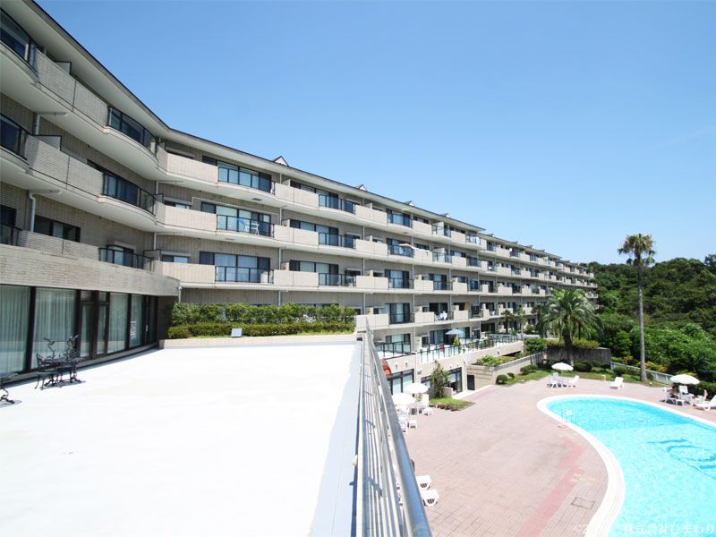 The condominium complex features a stately entrance, a Victoria-style lobby, an onsen large communal bath, an open-air bath, a spacious indoor pool, a central courtyard and garden with cherry trees, a tennis court, and a front desk. Shared amenities include a hot spring large bath (with source-flowing and circulating filtration, large-scale repairs completed April 2017), an indoor qua pool (open Fridays, Saturdays, Sundays, and holidays), an outdoor pool (open during special summer periods), a sports room, an owner-only guest room (reservation required two months in advance), a coin laundry, a pool bar (with karaoke), golf facilities, a convention hall, spaces for Go and Shogi, billiards, a piano, and a mahjong set available for loan. Parking is available with 47 outdoor spaces at the third building (free) and 47 outdoor spaces in front of the main entrance (charged on weekends/holidays/peak season).