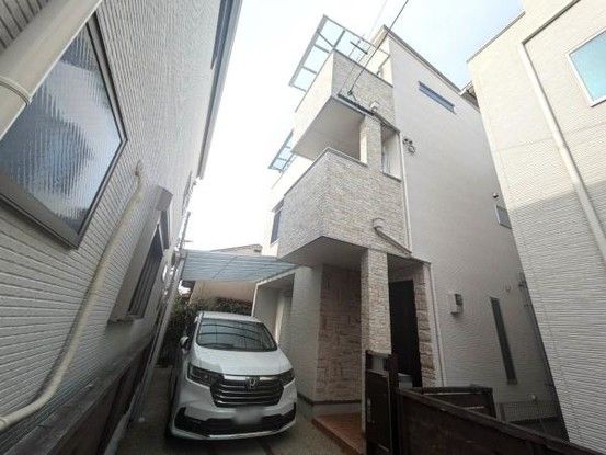 This modern detached house, built in July 2021, offers a comfortable and convenient lifestyle in Kadoma City, Osaka. The property features a spacious 4LDK layout across three floors, with a total floor area of 114.2㎡. The living room is designed with a high, sloped ceiling, creating a sense of openness and space. A key feature is the open-plan kitchen facing the living area, allowing for easy interaction and supervision of children while cooking.