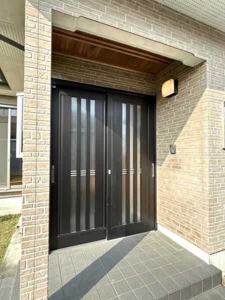 The house includes a spacious living room of approximately 18 tatami mats, three Western-style rooms (approximately 6.5, 6, and 6.5 tatami mats respectively), and one Japanese-style room of approximately 8 tatami mats. The Japanese room has storage and a tokonoma (alcove). All Western rooms have pole-equipped closets, and the north-east room features a walk-in closet. The kitchen is a system kitchen with an IH stove, and there is a separate service entrance (kattaguchi). The property is all-electric with no gas. Water supply is public, and the drainage system uses a septic tank. Additional features include air conditioning, a shower toilet, a shoe closet (shoesクローク), a wood deck, and a warehouse with a shutter. The property has parking for up to 4 cars.