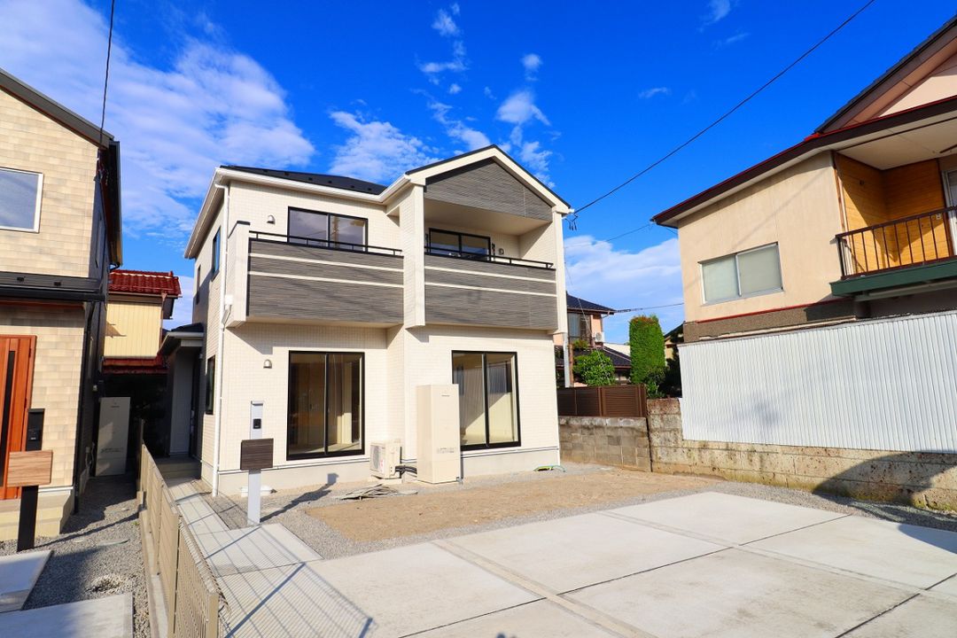 This newly constructed detached house, part of the Blooming Garden development in Date City, Fukushima Prefecture, offers a spacious and well-equipped living environment. The property, specifically Building 3, features a 4LDK layout with a total floor area of 107.23 square meters on a land plot of 165.52 square meters. The design incorporates a 20-tatami mat living-dining-kitchen area with a raised ceiling that exposes beams, creating a sense of openness and comfort. Key amenities include an all-electric system, a kitchen with a dishwasher, a pantry with adjustable shelving, a built-in wardrobe, and a roofed inner balcony for convenient laundry drying.