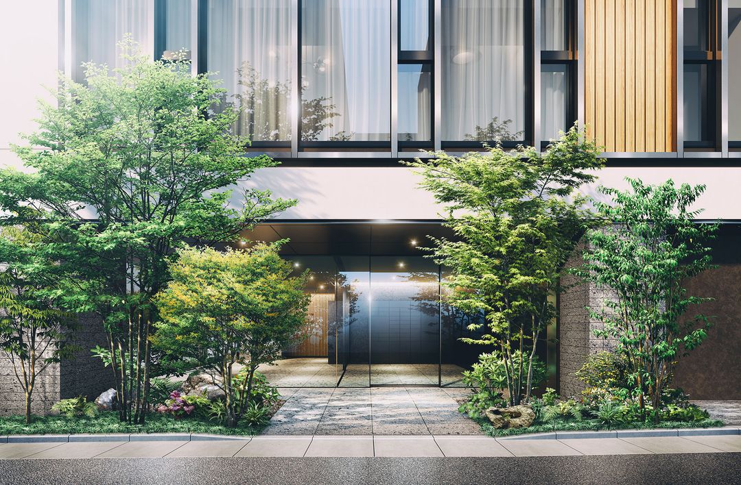Important notes regarding the images: The exterior completion renderings and other CG images are based on design-stage drawings, and the shapes, colors, etc., may differ from the final product. Detailed shapes and equipment are not represented. The depicted landscaping is also at the design stage and is subject to change. The leaf colors, branch shapes, and tree forms are conceptual, representing a state after a growth period post-completion, and do not indicate a specific season. Surrounding buildings have been omitted from the images.