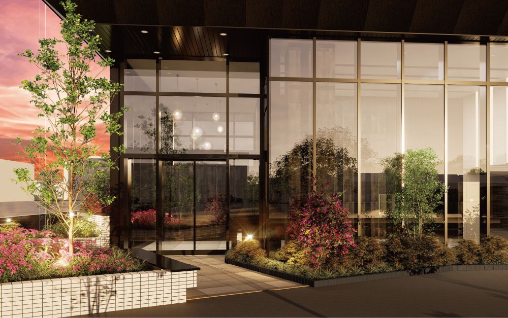 The development prioritizes a safe and pleasant station-front lifestyle. The land plan features a dedicated flat parking lot within the grounds for all residences, pedestrian-vehicle separation for safe movement, and a variety of shared amenities. Residents are welcomed by a sophisticated two-story atrium entrance. Unit layouts range from 2LDK to 3LDK, with exclusive areas from 56.47㎡ to 81.61㎡. High-quality finishes include artificial marble kitchen counters, flagstone flooring in wet areas, and easy-to-clean organic glass-based fixtures. Security is robust, with a 24-hour security company partnership, surveillance cameras in common areas, and earthquake-resistant entrance door frames designed to remain operable to ensure an escape route.