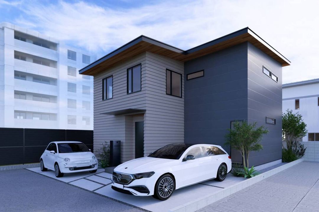 The proposed home design features a dignified black and greige exterior. The entrance is planned to include a walk-in closet (WIC), storage, and a shoe closet (SC). The living, dining, and kitchen (LDK) area is a spacious 22.7-tatami mat open space. The south-facing side opens to a garden area suitable for barbecues, a pool, or a vegetable garden. The kitchen is designed as an open peninsula-style facing kitchen, and the wet areas are consolidated near the kitchen for efficient household workflow. The second floor is planned to include a roughly 10-tatami and a 9.5-tatami master bedroom, each with a capacious walk-in closet.