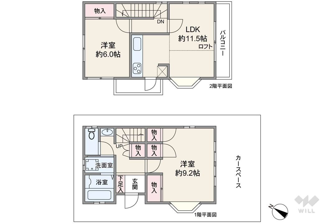 The home features a 2LDK layout with a total floor area of 69.04 square meters. The living, dining, and kitchen area is situated on the second floor and spans approximately 11.5 tatami mats, creating a bright and airy space. The interior design utilizes a stylish palette of white and brown tones. Key equipment includes a system kitchen that integrates storage and is easy to clean and maintain, a bathroom with a dryer (useful for drying laundry on rainy days and ventilating the room after bathing), and a TV monitor-equipped doorphone for secure and convenient visitor screening. Additional features include underfloor heating, an all-electric system, a walk-in closet, storage in all rooms, a separate washbasin, a dishwasher/dryer, and a free parking space.
