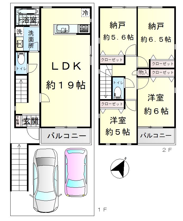 The property is equipped with numerous desirable features. The kitchen comes with a dishwasher-dryer, and the bathroom includes a reheating function for the bath and a bath dryer, perfect for drying laundry on rainy days and keeping the bathroom fresh. For security and convenience, the home has a camera-equipped intercom and post. Each room is fitted with a closet, and there is additional storage under the stairs and in the second-floor hallway. The house also includes a shoe cupboard and features two balconies, one on each floor. A significant advantage is the provision of parking space for two cars, a valuable asset for families and guests. The property is south-facing, ensuring good natural light.