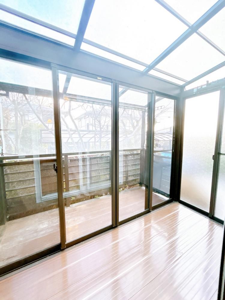 The property boasts a sunroom accessible from the living room, leading out to a generous garden where the landscaping is being trimmed, offering potential for a vegetable garden. A two-story atrium brings natural light into the interior. Parking is available for two cars on a spacious front road approximately 6.1 meters wide. The seller provides a 2-year warranty covering the three major risks of used homes: roof leaks, defects/corrosion in major structural components, and water supply/drainage leaks or failures. A termite prevention treatment with a 5-year guarantee (plus two free inspections) will also be completed before handover.