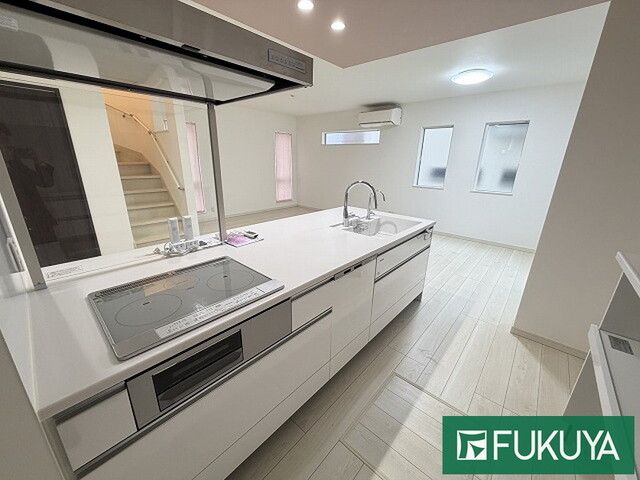 The home is equipped with a stylish island-style kitchen featuring a system kitchen setup, a counter, and a dishwasher. For year-round comfort, underfloor heating is installed in the living and dining area, keeping feet warm during colder months. The bathroom is fitted with a drying function, useful for drying laundry on rainy days and for ventilating the room after bathing, making maintenance easier. Other notable equipment includes an all-electric system (IH cooking hob), a walk-in closet, storage in all rooms, a TV monitor-equipped doorphone, a shower-equipped vanity, a washlet toilet seat, and a bath with reheating function.