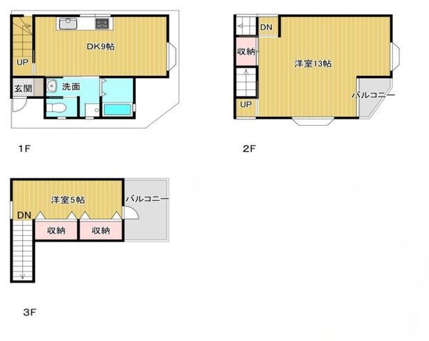This terraced house, located in Yao City, Osaka Prefecture, offers a comfortable living space with a total floor area of 61.83 square meters. Built in June 1994, the property is a three-story wooden structure situated on a 39.07 square meter plot of land. The layout is a practical 2DK, providing two rooms plus a dining-kitchen area.