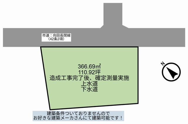 Important remarks from the agent state that there are no builder restrictions, so you can build with your preferred manufacturer. Water and sewer services are complete. It is a 7-minute walk to Kitashin Elementary School. There are separate fees required for water connection and beneficiary charges. The property is subject to the Landscape Act and city ordinances. The school district is Kitashin Elementary School and Kita Junior High School. There is a notice of acceptance under Article 5 of the Agricultural Land Law (Notification No. 2-73 from the Agricultural Committee). There is a setback required on the north side where it fronts the road. Regarding the sewer system, the purchaser must apply in their personal name, and construction will be carried out at public expense. Legal restrictions include landscape ordinances, and there is a possibility of utility poles and guy wires being installed.