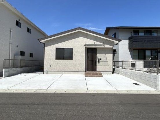 The house is a single-story home with all rooms having storage. The living room is approximately 14 tatami mats in size and features an open-plan kitchen facing the living area, allowing for easy conversation with family. The three bedrooms are all Western-style rooms: a 4.5 tatami mat room near the entrance, a 5.2 tatami mat room in the middle, and a 6 tatami mat room at the back. All bedrooms have closets with shelves and hanging pipes.