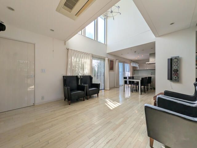 This substantial detached house, built in April 2007, offers a generous 171.15㎡ of living space across two stories, situated on a large 337.00㎡ plot. The layout is a versatile 6SLDK, featuring three Japanese-style rooms and five Western-style rooms, including a remarkably open-concept living, dining, and kitchen area (LDK) of approximately 27.0 tatami mats with a double-height ceiling.