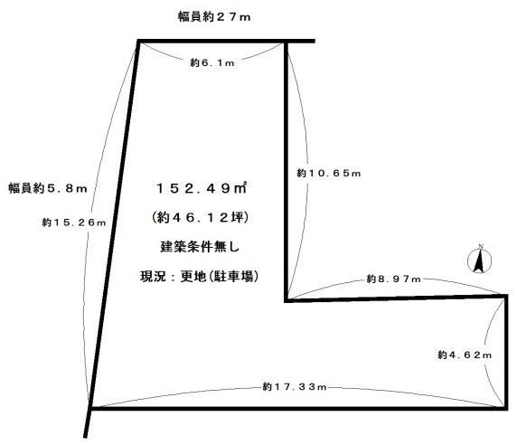 This plot of land is located in the Minami Ward of Kyoto City, offering a prime opportunity for development in a well-connected urban area. The property is situated within a commercial zoning district, providing flexibility for various uses. It is a corner lot with road frontage on two sides: approximately 27 meters on the north side and 5.8 meters on the west side, both public roads. This corner location qualifies for a building coverage ratio relaxation, increasing the allowable ratio from 80% to 90%. The floor area ratio is 500%.