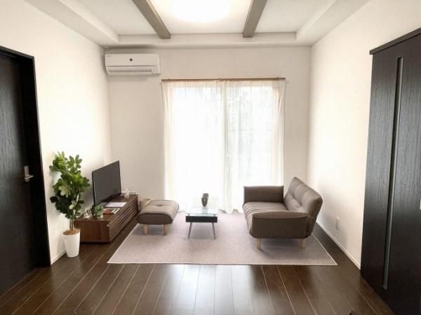 The interior layout is simple and highly functional. A 13-tatami mat LDK (Living-Dining-Kitchen) is centrally positioned, creating a practical core for daily life. Each Western-style room is equipped with a substantial closet. The bathroom, washroom/laundry area, and toilet are efficiently consolidated in the design. The kitchen is user-friendly with abundant storage and a well-defined cooking space, efficiently arranged with a gas stove and sink, all finished with a calm wood-grain design. The living area benefits from large windows that fill the space with natural light, enhancing the sense of openness. Wood-grain flooring and simple furnishings create a relaxed atmosphere, accentuated by ceiling design and lighting. The overall aesthetic throughout is one of simple, organized spaces with a refined contrast of white and dark brown tones.