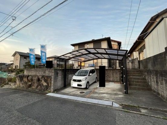 The property's equipment and facilities include: Gas type: None; Water supply: Public; Drainage type: Sewer; Shampoo dresser; Kitchen: System kitchen; Hot water supply; All-electric; Balcony; Hob: IH; Service entrance. The house is all-electric, featuring an IH cooktop in the kitchen. The bathroom has a generously sized washing area. The entrance includes a shoe box for storage. The staircase is equipped with handrails for safety. The property includes a carport for two vehicles and garden space.