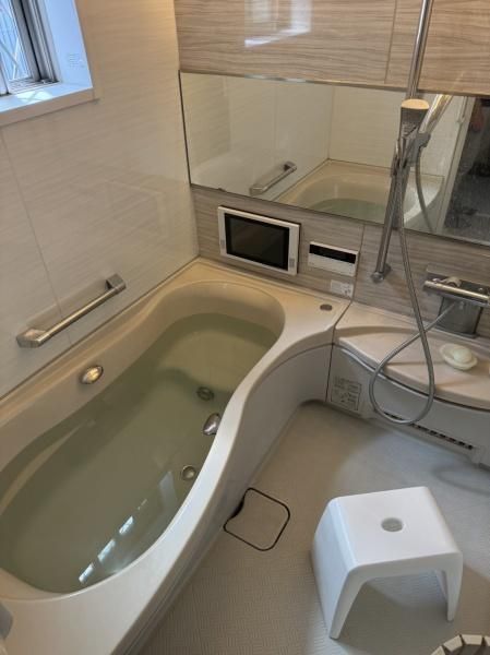 The house features a 4LDK layout, providing four bedrooms and a combined living, dining, and kitchen area. Key equipment includes a system kitchen, which integrates storage and is designed for easy cleaning. The kitchen is equipped with a gas cooktop. The bathroom is fitted with a reheating function and a bath dryer. Other notable interior features include a walk-in closet, storage in all rooms, a TV monitor-equipped door phone, and underfloor heating. The property is all-electric and incorporates barrier-free design elements. It has a south-facing orientation and comes with a free parking space for one vehicle. Utilities include public water supply, city gas, and sewer system. The property also has a balcony.