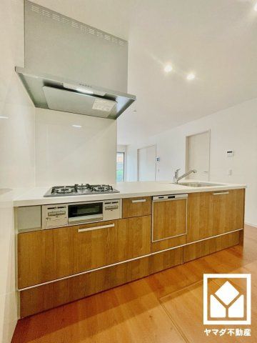 The property is equipped with a system kitchen, counter kitchen, and a dishwasher. The bathroom and toilet are separate, and the bathroom includes a bath reheating function, a shower-equipped washbasin vanity, a heated toilet seat, and a bath dryer. The house features wooden flooring, a south-facing balcony, and comes with lighting fixtures. Infrastructure includes public water supply, city gas, and sewer systems. The property also comes with parking space for two vehicles.