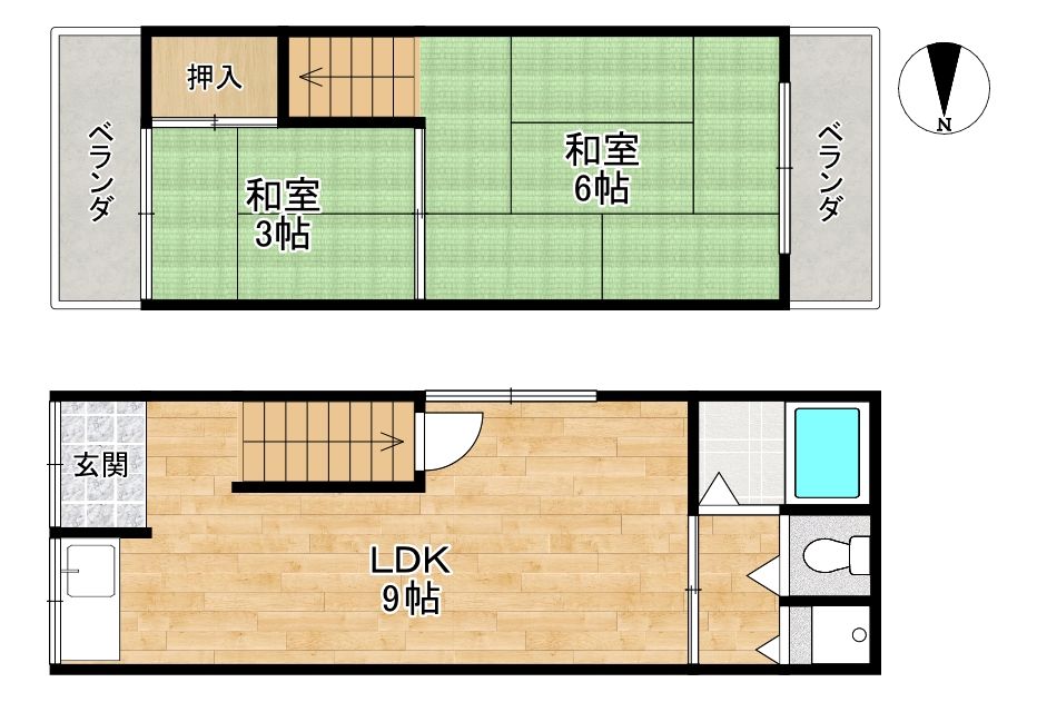The residence itself is a two-story wooden terraced house built in October 1969. It offers a compact yet functional 2LDK layout with a total floor area of 37.81 square meters. The property sits on a corner lot with a land area of 32.92 square meters. Key features include a system kitchen equipped with a gas cooktop, allowing for powerful and precise cooking. The unit also has a dedicated indoor space for a washing machine, which helps protect the appliance and extends its lifespan. Other notable equipment includes a shower-equipped vanity, a bidet toilet seat, underfloor heating, a TV monitor intercom, and ample storage with a walk-in closet and storage in all rooms. The property utilizes cost-effective and environmentally friendly city gas for its utilities.