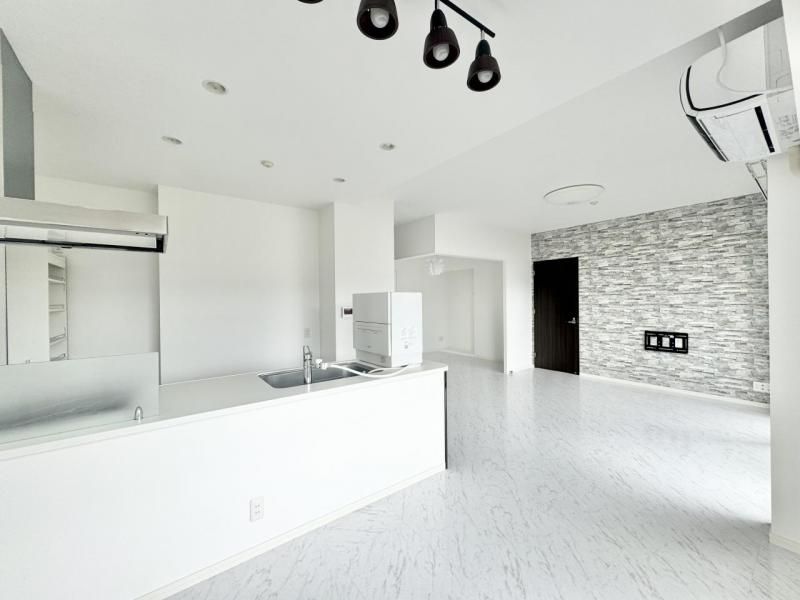 Key equipment includes a system kitchen with a dishwasher/dryer, a separate bath and toilet, a shower, a washbasin with a vanity mirror, a warm-water washing toilet seat, a bathroom dryer, an independent washroom, bathroom heating, and a designated space for a washing machine. Storage is ample with closets in all rooms and a shoe-in closet. The unit is equipped with air conditioning, lighting fixtures, and features all-wood flooring. A standout feature is the access to natural hot spring water, allowing residents to enjoy an onsen bath at home.