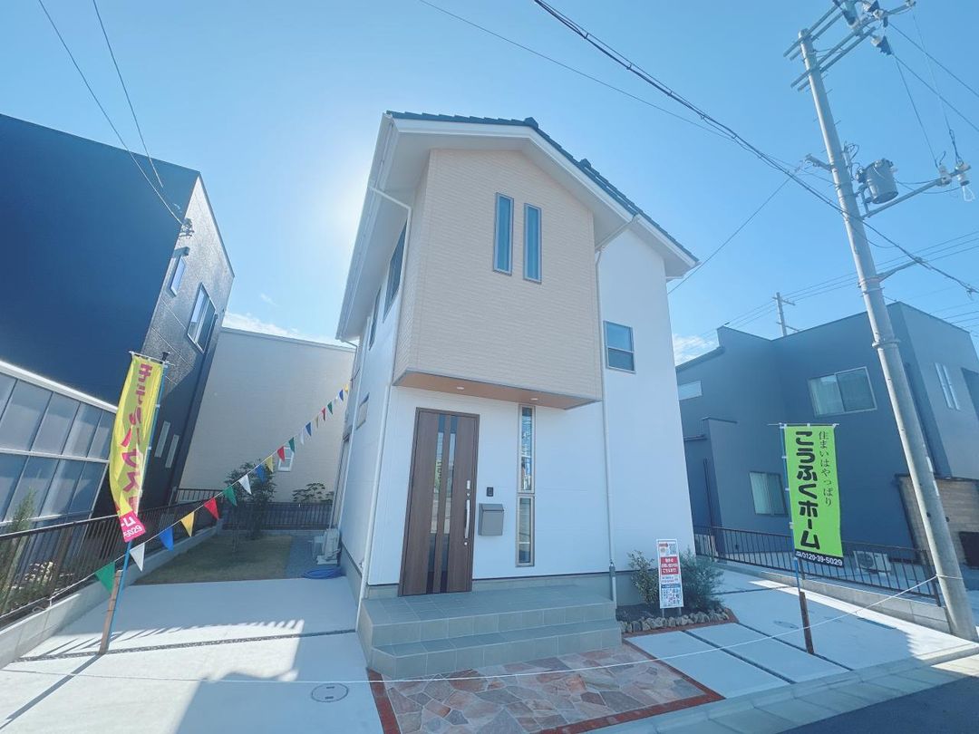 The property is a 2-story wooden structure built in April 2025 (2 years old). The total floor area is 91.91 sqm, and the land area is 132.24 sqm (measured). The layout is 3LDK. Parking is available with space for 2 cars at no charge. The property is currently vacant and available for viewing. The construction company is Kofuku Kensetsu Co., Ltd.