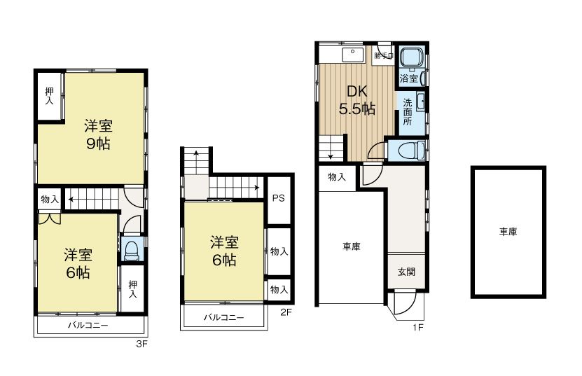 The house is a 3-story wooden structure built in October 1988, offering a total floor area of 72.95 square meters. The layout is a 3DK, providing a dining kitchen and three separate rooms. The land area is 52.15 square meters. The property is currently vacant and ready for immediate handover.